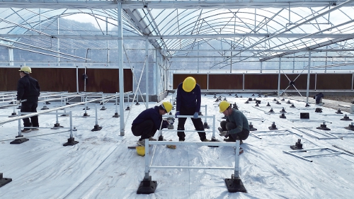 图为工人正在改造新式蔬菜大棚。 田亚敏 摄