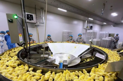 图为日前,在盐亭县经开区绵阳鸾翔凤集食品公司凤妮可孵化中心,工人通过智能化设备筛选种鸡。
