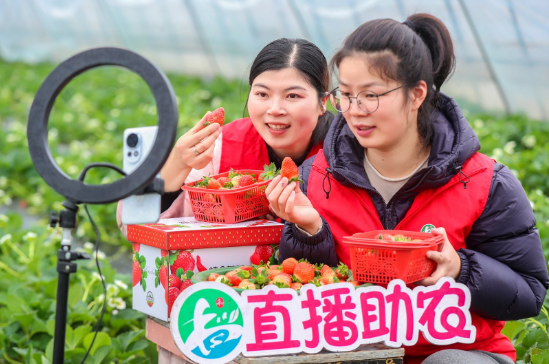 近年来,浙江省湖州市长兴县积极探索“直播+助农+电商”新模式,拓展农产品销售渠道,助力农民增收致富。当地青年党员志愿者近日在太湖街道留下村共富基地开展了第三届“党员直播带货 助力草莓销售”助农活动。