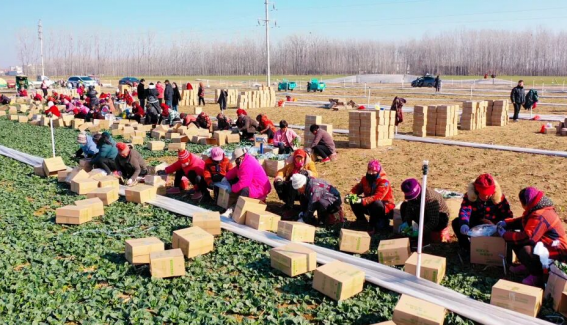 镜头之外的田垄间,200余名来自周边村落的农户正忙着采摘、装箱、称重、装车,动作娴熟利落。一位正在务工的老人边摘菠菜边笑着说:“出来摘菠菜,既能挣钱,又能跑跑转转,心里高兴得很。”以往冬闲时节,很多赋闲在家的老人并无额外收入来源,如今在家门口的蔬菜基地务工,每天能赚七八十元零花钱。