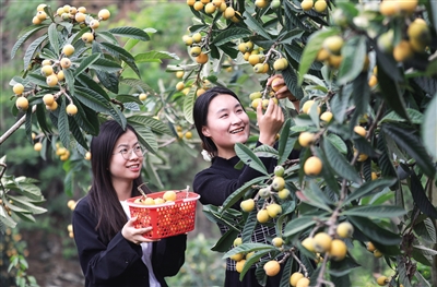 近年来,贵州省黔西市素朴镇在巩固脱贫成效和推进乡村振兴过程中,按照“农业生态化、生态产业化”的思路,发展枇杷产业连片种植,还修通水泥村级公路,方便游客进园采摘,从而发展集采摘体验、休闲观光于一体的乡村旅游,助力乡村振兴。图为黔西市素朴镇古胜村的农户和游客正在采摘枇杷。