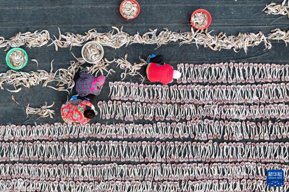 11月30日,河北省唐山市丰南区黑沿子镇的渔民在晾晒鱼干。