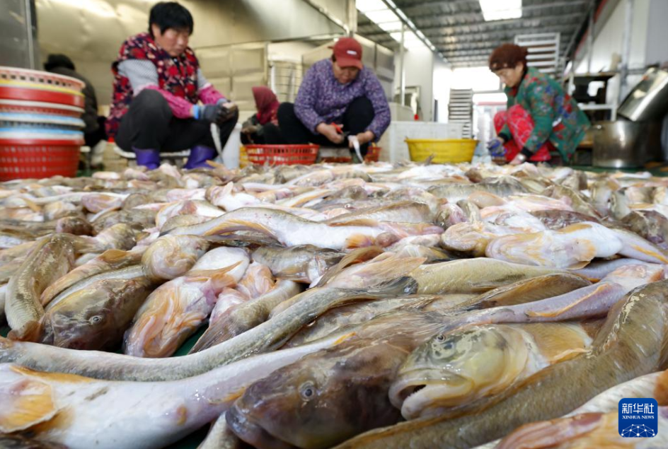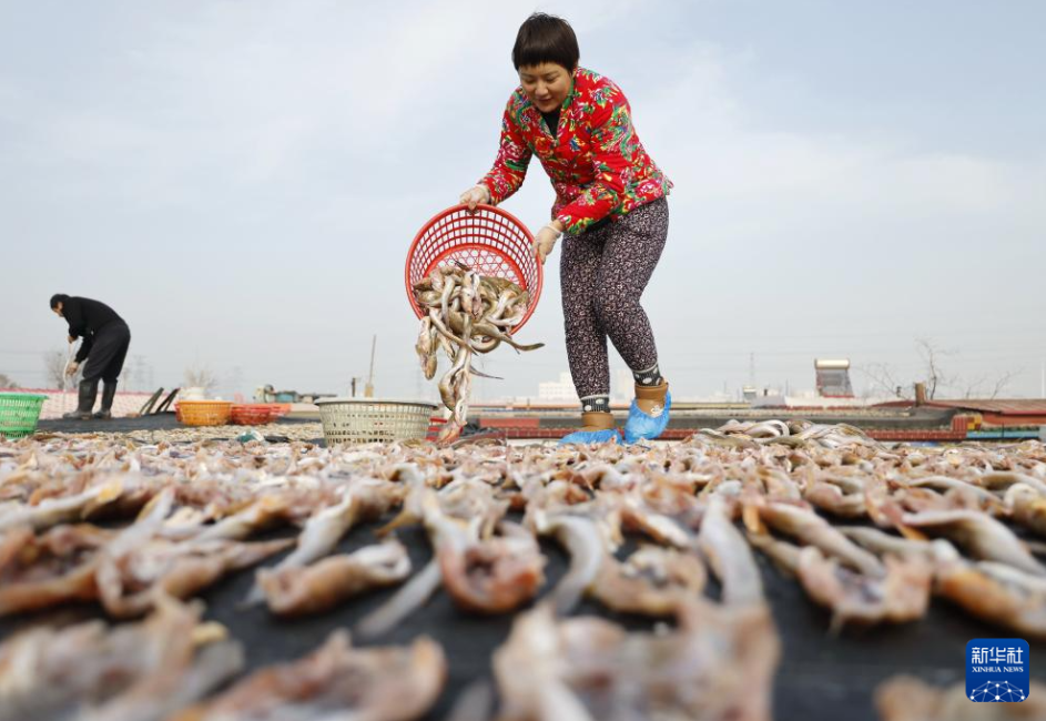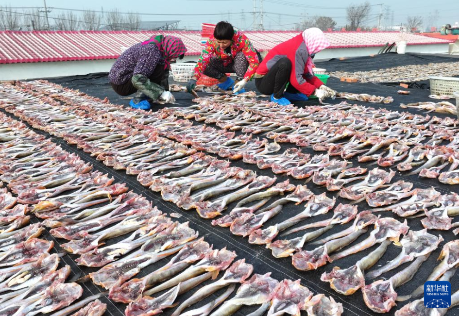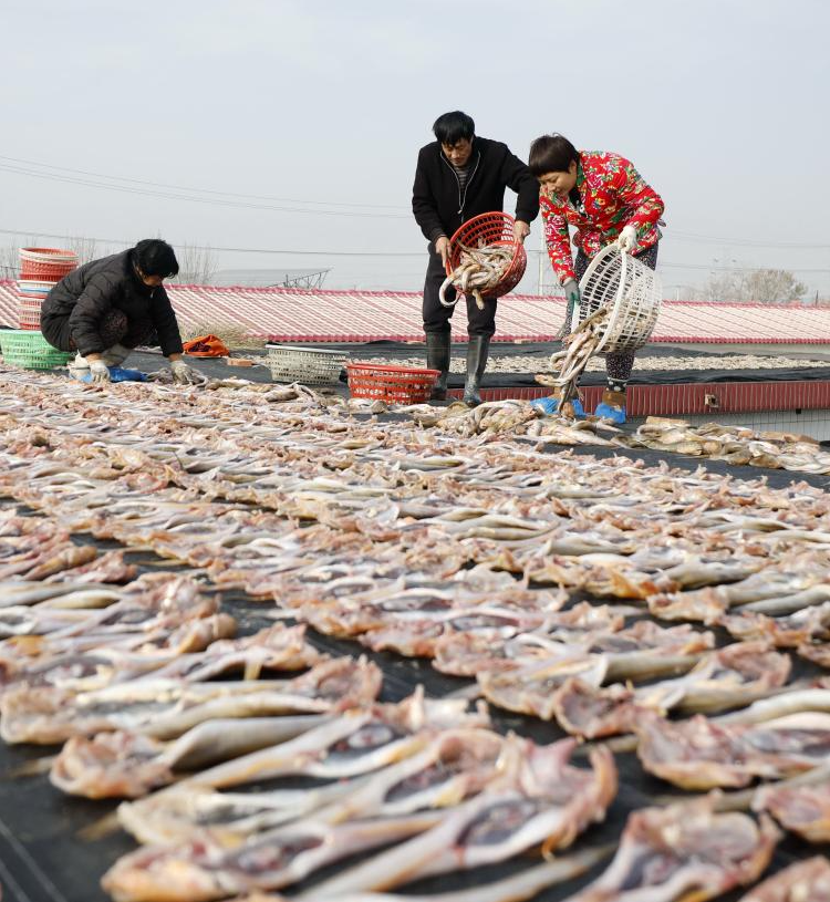 初冬时节,河北省唐山市丰南区黑沿子镇的渔民利用晴好天气,将捕捞的鱼虾等海产品进行加工、晾晒,供应市场。