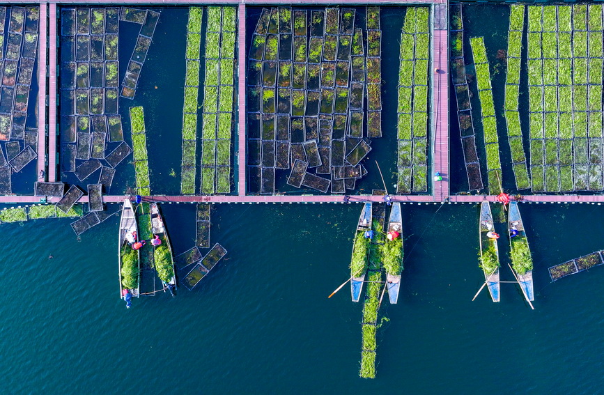 2025年12月10日,浙江杭州淳安县千岛湖南山生态浮岛上,工作人员正在栽植适合冬季生长的水生蔬菜水芹。
