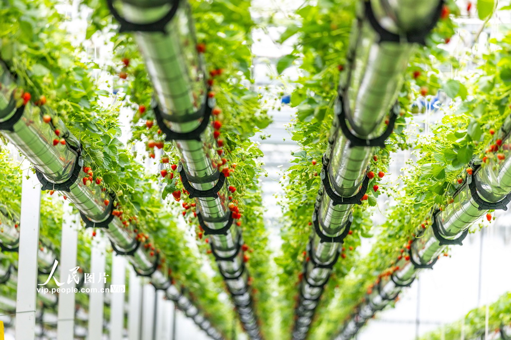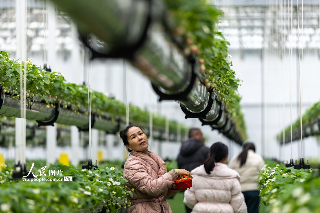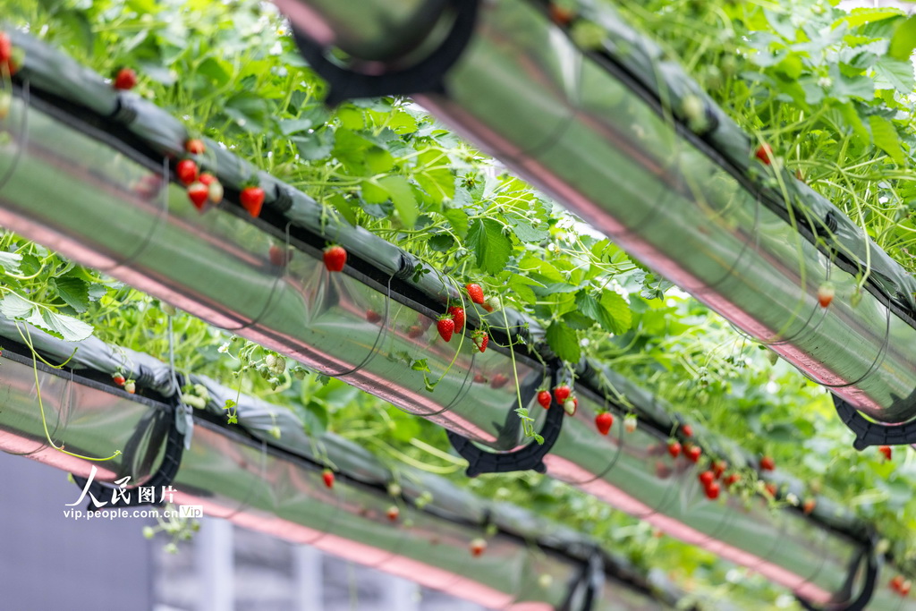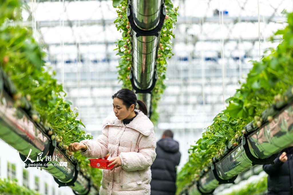 2025年12月24日,安徽省六安市裕安区徐集镇紫荆花智慧农业产业园的空中草莓园内,游客们穿梭其间,体验采摘乐趣。张军摄