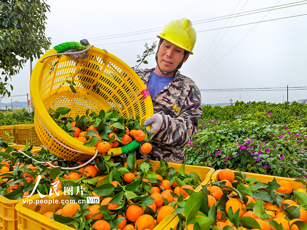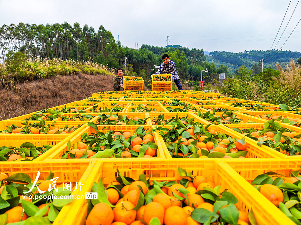眼下,广西金秀瑶族自治县的沙糖桔陆续成熟,果农们正忙着采摘、分拣、搬运、装车外销,田间地头一派繁忙的丰收景象。高如金摄(人民图片网)