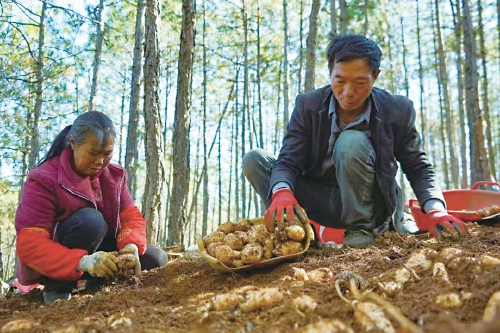 独特的气候和地理环境孕育了贵州省毕节市威宁彝族回族苗族自治县丰富的生物资源,其中中草药资源更是得天独厚。近年来,威宁县因地制宜,把天麻产业作为重要抓手,不断拓展群众增收渠道,通过加强天麻基地建设、种源保护、良种繁育等,全力发展壮大天麻产业,激活自身“造血”功能;同时,注重产业结构优化升级,推动天麻产业从单一的种植向深加工、品牌化、市场化方向发展,带动更多群众增收致富。目前,威宁县天麻产业主要涉及哲觉镇、大街乡、石门乡、雪山镇、兔街镇等乡镇,全县天麻种植面积6972亩,亩均收入达1.8万元以上,带动了当地村民增收致富。图为务工群众在采收天麻。 卯升林 摄