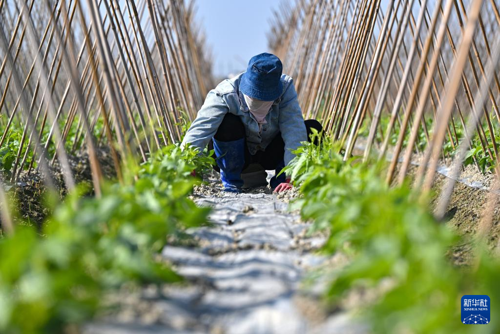1月8日,农民在海南省澄迈县瑞溪镇罗浮洋蔬菜种植基地灌溉豇豆田。