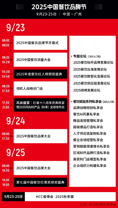 由广州市商务局指导,世界中餐业联合会、红餐网联合主办,以“蝶变·跃升”为主题的2025中国餐饮品牌节(红餐·第34届HCC餐博会)将于9月23-25日在广州举办。