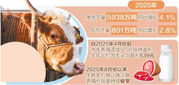 总体看,农业农村部指导各地加快落实稳产能、强金融、降成本、促消费等系列举措,推动肉牛养殖扭亏为盈,奶业生产筑底企稳。在各方面共同努力下,2025年全国牛肉产量801万吨,同比增长2.8%,自2025年4月份起,肉牛养殖连续9个月保持盈利,全年出栏肉牛头均盈利539元;2025年8月份以来,生鲜乳价格止跌企稳,养殖亏损面持续收窄。