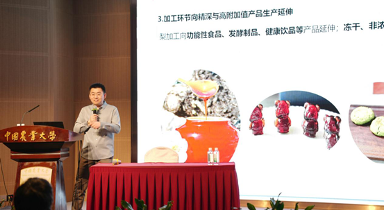 肖凯首先剖析了中国梨产业现状。中国作为全球梨生产大国,种植面积稳定在1300万亩以上,呈现明显区域集中化特征。种植端广泛采用“智能监测+精准管理+数字溯源”等现代化技术,加工环节向功能性食品、发酵制品等高附加值方向延伸,流通效率通过全程冷链显著提升。但标准化程度低、品牌保护弱、产业链短、营销渠道单一等难题,仍是产业升级的关键制约。