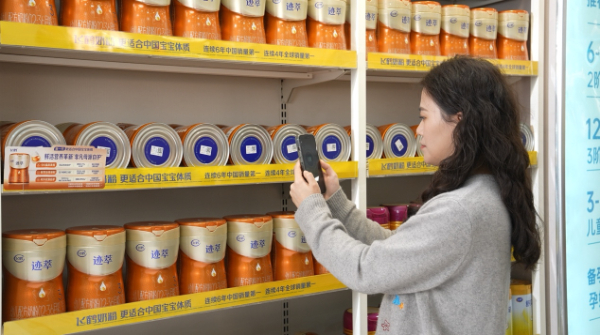 消费者正扫描货架上“躺倒”的奶粉罐底码