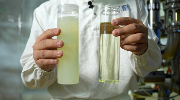 右侧为飞鹤自产新鲜乳清蛋白液。相较传统工艺,飞鹤自产乳清蛋白液的新鲜度、纯净度更优